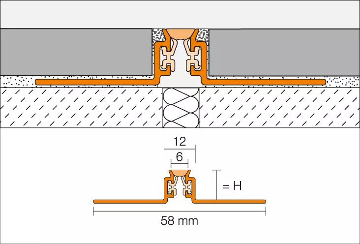 DILEX-AKWS deformācijas šuves profila sānu stiprināšanas kājas ir izgatavotas no alumīnija un savienotas ar deformācijas zonu, kas izgatavota no mīkstas plastmasas.