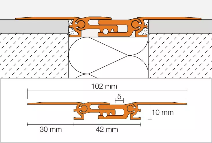 DILEX-BTS deformācijas šuvju profils, kas izgatavots no alumīnija, un paredzēts uzstādīšanai jau uz gatavām virsmām. Tas spēj absorbēt kustību trīs dimensijās.