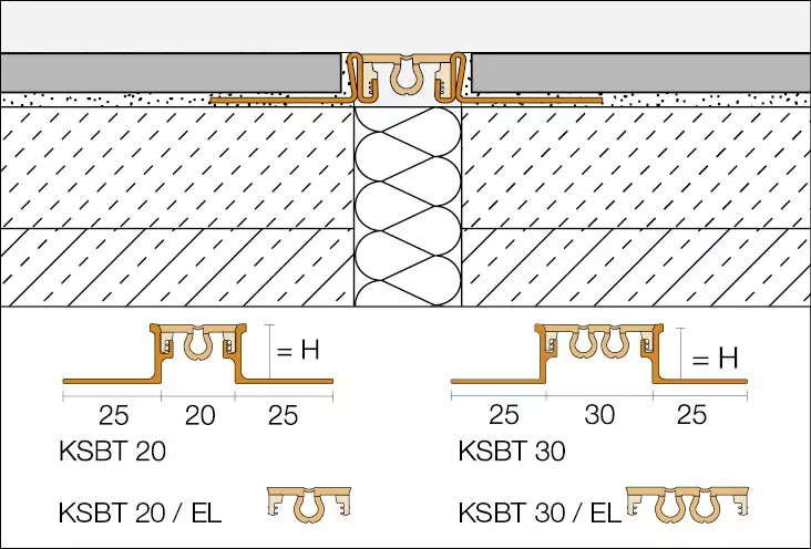 DILEX-KSBT profils konstruktīvām deformācijas šuvēm ar seguma malu aizsardzību. T;a malu stiprināšanas kājas ir izgatavotas no alumīnija (-AKSBT), V2A nerūsējošā tārauda (-EKSBT) vai V4A nerūsējošā tērauda (-EKSBT V4A). Deformācijas zona ir no elastīgas gumijas un pieejama divos platumos: 20 vai 30 mm.