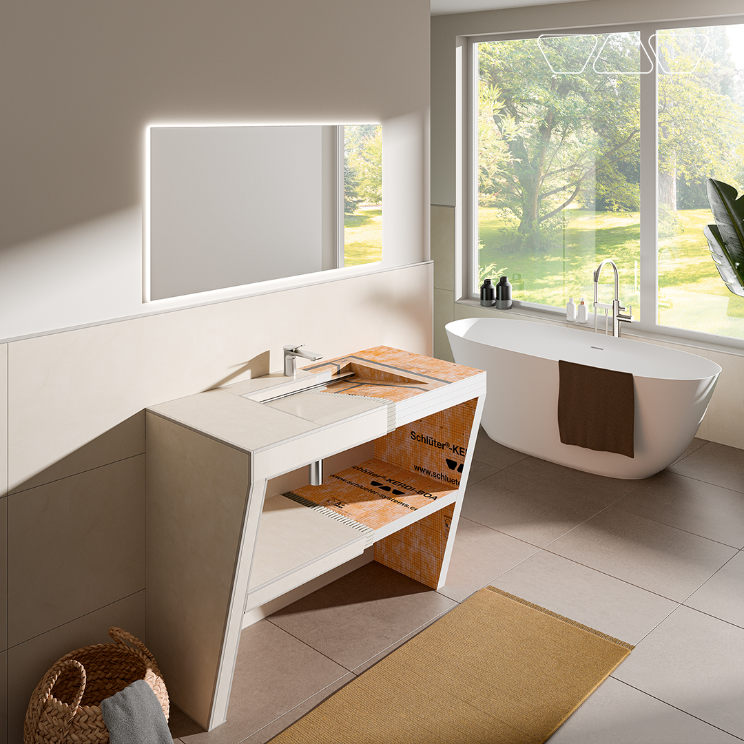 Izlietnes sagatave standarta jaucējkrāniem ir ne tikai funkcionāls risinājums, bet arī izteiksmīgs dizaina akcents jebkurā vannas istabā. Nav pārsteigums, ka šāds risinājums kļūst arvien populārāks. Lai izlietnes uzstādīšana būtu ātra un vienkārša, esam izstrādājuši iepriekš izgatavotu, taču pielāgojamu KERDI-BOARD elementu. To iespējams flīzēt tieši, bez papildu sagatavošanas. Turklāt tas izceļas ar nelielu svaru un ērtu lietošanu.