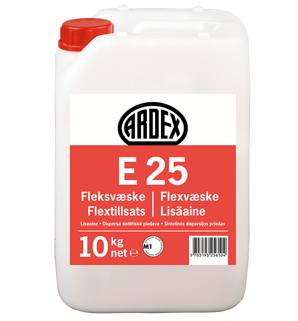Šķidra, rozā krāsā sintētisko sveķu piedeva ARDEX pašizlīdzinošajiem maisījumiem, javām un špaktelēm. Palielina elastību un nodilumizturību. Palielina virsmas cietību. ARDEX E 25 nevar lietot kopā ar ARDEX K 5 špakteli un ARDEX A 55 S pašizlīdzinošo maisījumu. Bez šķīdinātājiem.